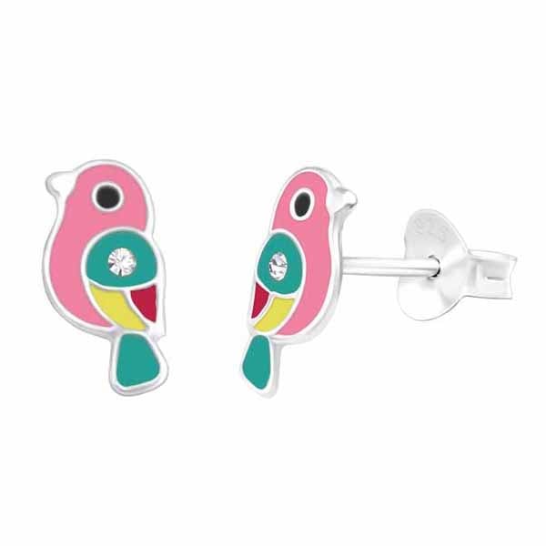 Lasten hopeiset lintu-korvakorut. Kauniit ja värikkäät lintu-korvakorut kirkkailla säihkyvillä zirkoneilla. Korvakoruissa on luotettava tappikiinnitys. Korvakorujen koko on 5 x 10 mm. Sirot ja kevyet nappikorvakorut, joita lapsi voi käyttää arjessa! Korvakorujen valmistusmateriaali on laadukas nikkelitön 925 sterling hopea.