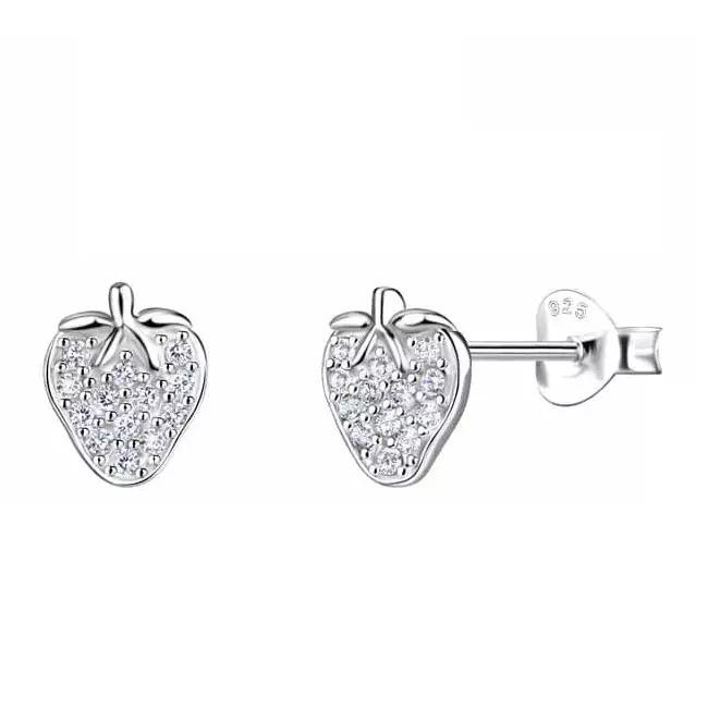 Lasten hopeiset mansikka-korvakorut. Mansikat on koristeltu kirkkailla zirkonia-korukivillä. Siron korvakorun koko on 6 x 8 mm. Korvakoruissa on luotettava tappikiinnitys. Korvakorujen valmistusmateriaali on laadukas nikkelitön 925 sterling hopea.