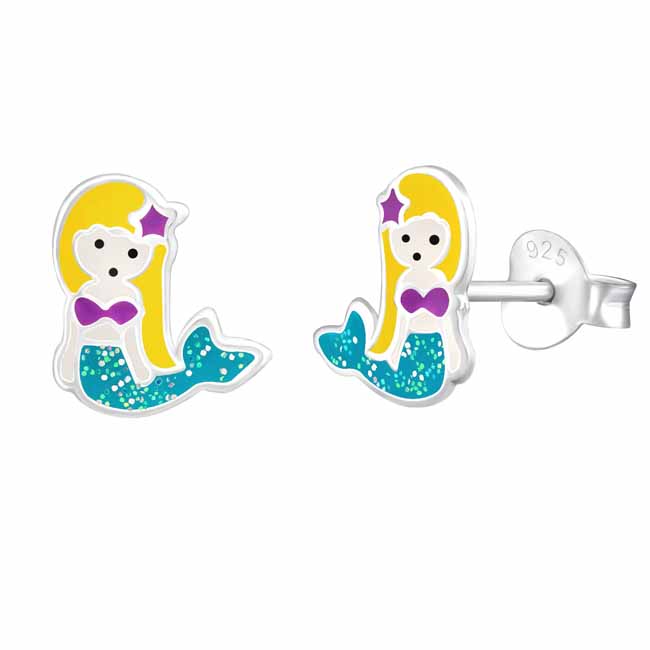 Lasten hopeiset merenneito-korvakorut. Kauniit hopeiset merenneitokorvakorut, joissa esiintyy merenneito turkoosilla glitter-pyrstöllä ja violeteilla yksityiskohdilla. Korvakoruissa on luotettava tappikiinnitys. Korvakorujen koko on 8 x 9 mm. Sirot ja kevyet nappikorvakorut, joita lapsi voi käyttää arjessa! Korvakorujen valmistusmateriaali on laadukas nikkelitön 925 sterling hopea.