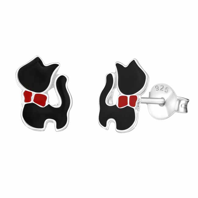 Hopeakorvakorut musta kissa punaisella rusetilla Lasten hopeiset kissa-korvakorut. Suloiset kissakorvakorut, joissa esiintyy musta kissa kaulassaan punainen rusetti. Korvakoruissa on luotettava... Lue lisää