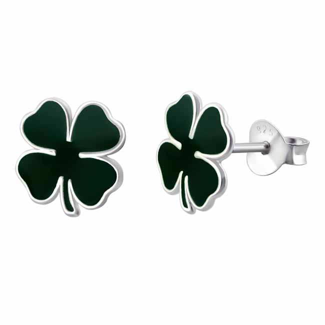 Lasten hopeiset neliapila-korvakorut. Suloiset lasten hopeiset korvakorut tummanvihreällä neliapilalla. Korvakoruissa on luotettava tappikiinnitys. Korvakorujen koko on 9 x 9 mm. Sirot ja kevyet nappikorvakorut, joita lapsi voi käyttää arjessa! Korvakorujen valmistusmateriaali on laadukas nikkelitön 925 sterling hopea.