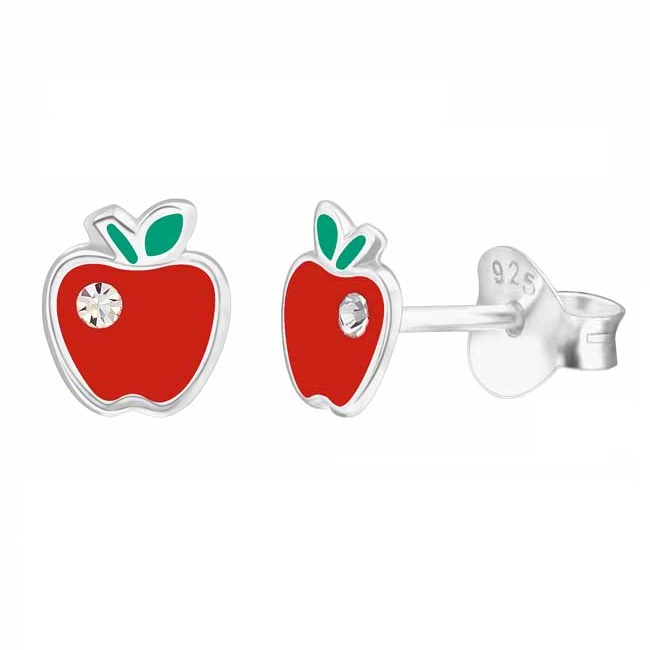 Lasten hopeiset omena-korvakorut. Suloiset punaiset omenat vihreällä lehdellä ja säkenöivällä zirkonia-korukivellä. Korvakoruissa on luotettava tappikiinnitys. Korvakorujen koko on 5 x 6 mm. Sirot ja kevyet nappikorvakorut, joita lapsi voi käyttää arjessa! Korvakorujen valmistusmateriaali on laadukas nikkelitön 925 sterling hopea.