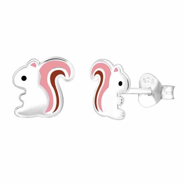 Lasten hopeiset orava-korvakorut. Suloiset pinkeillä hännillä varustetut orava-korvakorut. Korvakoruissa on luotettava tappikiinnitys. Korvakorujen koko on 7 x 7 mm. Sirot ja kevyet nappikorvakorut, joita lapsi voi käyttää arjessa! Korvakorujen valmistusmateriaali on laadukas nikkelitön 925 sterling hopea.