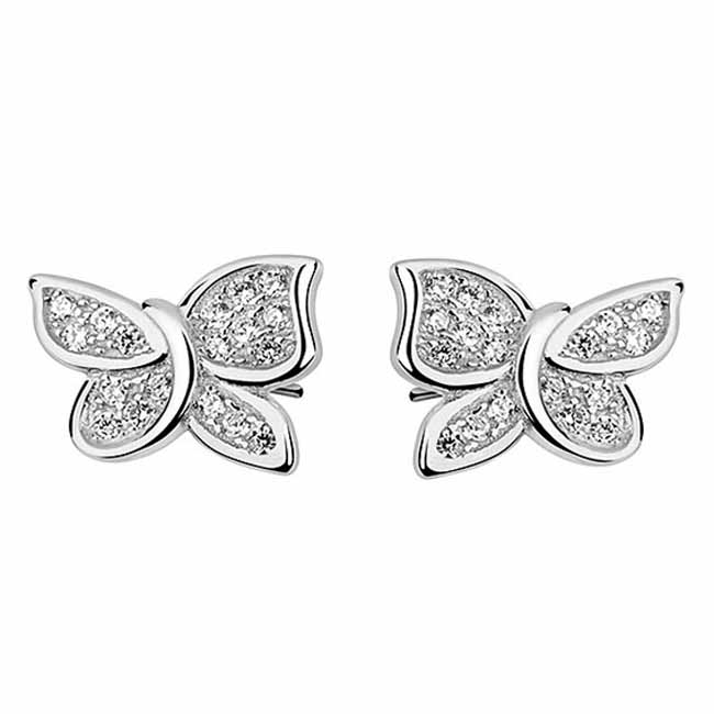 Lasten hopeiset perhonen-korvakorut. Kauniit perhoskorvakorut, joiden siipiä koristavat kirkkaat ja säihkyvät zirkonit. Korvakoruissa on luotettava tappikiinnitys. Korvakorujen koko on 8 x 11 mm. Sirot ja kevyet nappikorvakorut, joita lapsi voi käyttää arjessa! Korvakorujen valmistusmateriaali on laadukas nikkelitön 925 sterling hopea.
