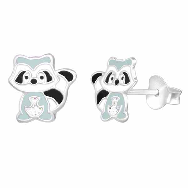 Lasten hopeiset pesukarhu-korvakorut. Suloiset harmaat pesukarhut mustavalkoisilla yksityiskohdilla. Korvakoruissa on luotettava tappikiinnitys. Korvakorujen koko on 9 x 9 mm. Sirot ja kevyet nappikorvakorut, joita lapsi voi käyttää arjessa! Korvakorujen valmistusmateriaali on laadukas nikkelitön 925 sterling hopea.