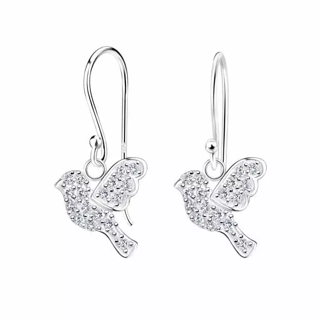 Hopeiset roikkuvat lintu-korvakorut. Korvakorujen koko on 11 x 12 mm. Linnut ovat koristeltu zirkonia-kivin. Korvakorujen valmistusmateriaali on laadukas nikkelitön 925 sterling hopea.