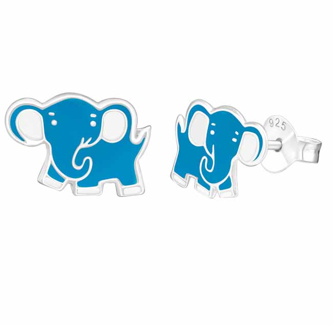 Lasten hopeiset elefantti-korvakorut. Suloiset lasten eläinaiheiset norsukorvakorut sinisillä hymyilevillä elefanteilla. Korvakoruissa on luotettava tappikiinnitys. Korvakorujen koko on 11 x 8 mm. Sirot ja kevyet nappikorvakorut, joita lapsi voi käyttää arjessa! Korvakorujen valmistusmateriaali on laadukas nikkelitön 925 sterling hopea.