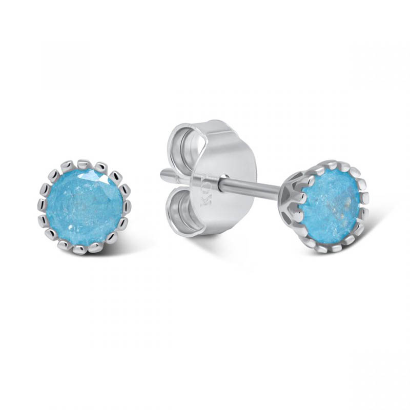 Pyöreät hopeakorvakorut, joissa on krysanttireuna ja siniset sameat zirkonikivet. Tappikiinnitys. Ihana vaaleansinisen sävy sopii erinomaisesti kiiltävään hopeaan.