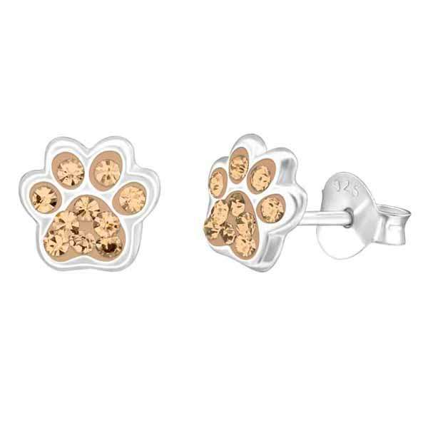 Lasten hopeiset tassu-korvakorut shampanjan värisillä zirkoni-korukivillä. Suloiset ja säkenöivät tassunjälki-korvakorut, joissa on luotettava tappikiinnitys. Korvakorujen koko on 7 x 6 mm. Sirot ja kevyet nappikorvakorut, joita lapsi voi käyttää arjessa! Korvakorujen valmistusmateriaali on laadukas nikkelitön 925 sterling hopea.