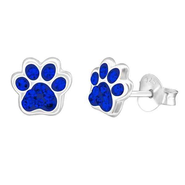 Lasten hopeiset tassu-korvakorut tummansinisillä zirkoni-korukivillä. Suloiset ja säkenöivät tassunjälki-korvakorut, joissa on luotettava tappikiinnitys. Korvakorujen koko on 7 x 6 mm. Sirot ja kevyet nappikorvakorut, joita lapsi voi käyttää arjessa! Korvakorujen valmistusmateriaali on laadukas nikkelitön 925 sterling hopea.