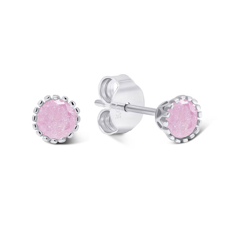 Pyöreät hopeakorvakorut, joissa on krysanttireuna ja pinkit sameat zirkonikivet.