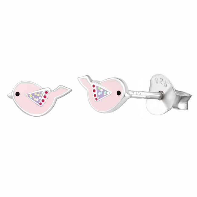 Lasten hopeiset lintu-korvakorut. Kestävät hopeiset lintukorvakorut, joiden vaaleanpunaiset linnut ihastuttavat siroudellaan ja siipien yksityiskohdillaan. Korvakoruissa on luotettava tappikiinnitys. Korvakorujen koko on 7 x 4 mm. Sirot ja kevyet nappikorvakorut, joita lapsi voi käyttää arjessa! Korvakorujen valmistusmateriaali on laadukas nikkelitön 925 sterling hopea.