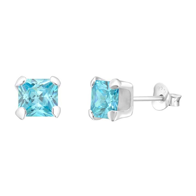 Hopeiset korvakorut neliön muotoisilla zirkoneilla. Klassisen malliset korukivi-korvakorut, joissa säihkyy neliön mallinen vaaleansininen zirkonia. Korvakorujen koko on 6 x 6 mm.