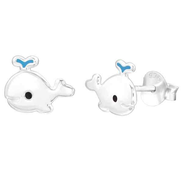 Lasten hopeiset valas-korvakorut. Suloiset valaat sinisillä vesisuihkuilla! Korvakoruissa on luotettava tappikiinnitys. Korvakorujen koko on 9 x 7 mm. Sirot ja kevyet nappikorvakorut, joita lapsi voi käyttää arjessa! Korvakorujen valmistusmateriaali on laadukas nikkelitön 925 sterling hopea.