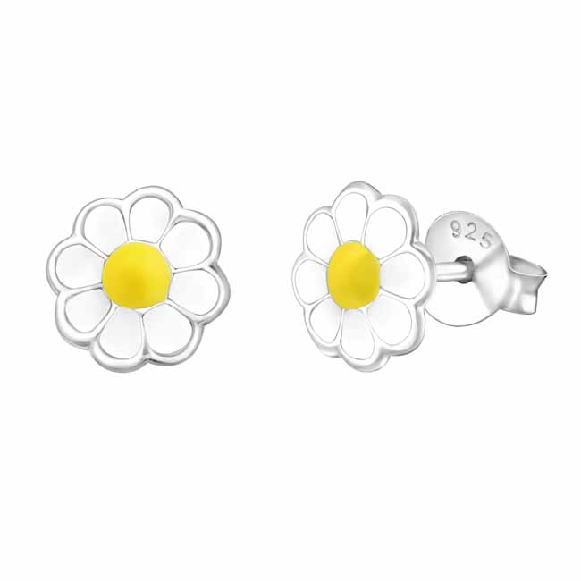 Lasten hopeiset kukka-korvakorut. Suloiset lasten hopeiset korvakorut, joissa on kaunis valkoinen kukka keltaisella keskiosalla. Päivänkakkara-korvakorut. Korvakoruissa on luotettava tappikiinnitys. Korvakorujen koko on 7 x 7 mm. Sirot ja kevyet nappikorvakorut, joita lapsi voi käyttää arjessa! Korvakorujen valmistusmateriaali on laadukas nikkelitön 925 sterling hopea.