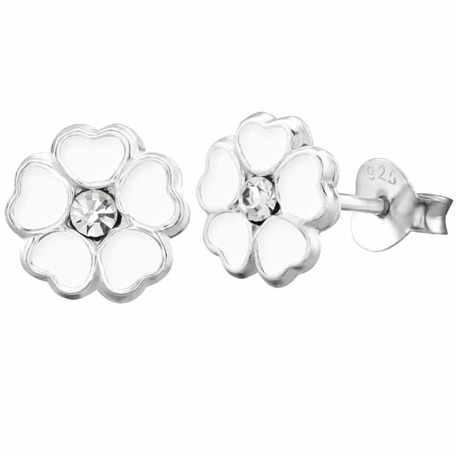 Lasten hopeiset kukka-korvakorut. Kauniit valkoiset kukkakorvakorut kirkkaana säihkyvällä zirkonia-korukivellä. Korvakoruissa on luotettava tappikiinnitys. Korvakorujen koko on 8 x 8 mm. Sirot ja kevyet nappikorvakorut, joita lapsi voi käyttää arjessa! Korvakorujen valmistusmateriaali on laadukas nikkelitön 925 sterling hopea.