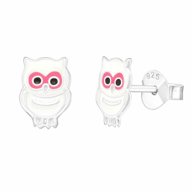Lasten hopeiset pöllö-korvakorut. Suloiset lasten hopeiset korvakorut valkoisella pöllöllä ja vaaleanpunaisilla yksityiskohdilla. Korvakoruissa on luotettava tappikiinnitys. Korvakorujen koko on 6 x 9 mm. Sirot ja kevyet nappikorvakorut, joita lapsi voi käyttää arjessa! Korvakorujen valmistusmateriaali on laadukas nikkelitön 925 sterling hopea.
