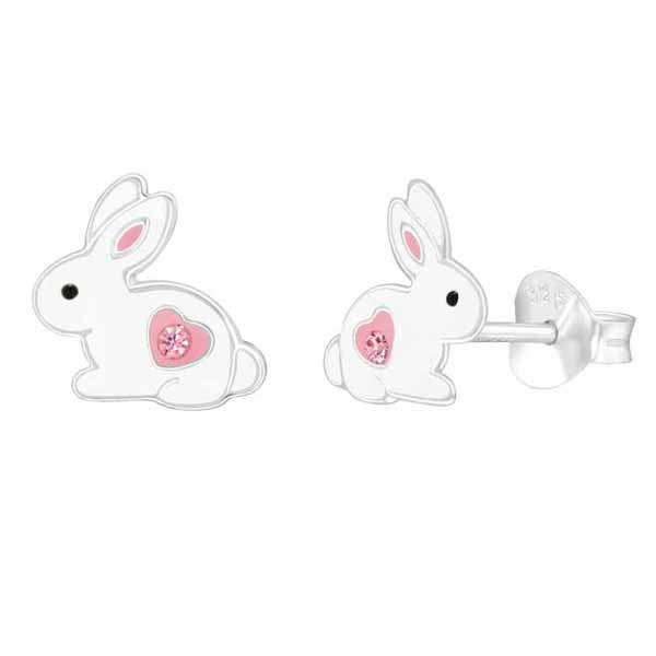 Hopeakorvakorut valkoinen pupu Lasten hopeiset pupu-korvakorut. Suloiset lasten hopeiset korvakorut valkoisella kanilla. Valkoinen jänis on makuuasennossa ja sitä koristavat vaaleanpunaiset... Lue lisää