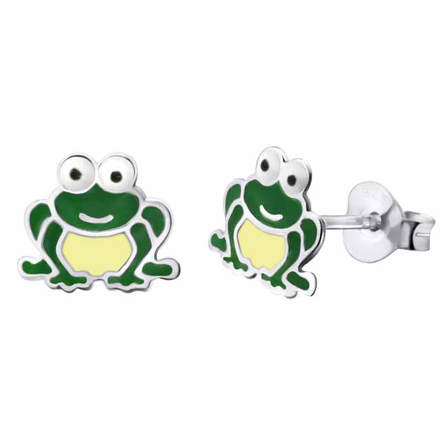 Lasten hopeiset sammakko-korvakorut. Suloiset lasten hopeiset korvakorut, joissa seikkailee vihreä sammakko luonnonvalkoisella vatsalla. Korvakoruissa on luotettava tappikiinnitys. Korvakorujen koko on 9 x 7 mm. Sirot ja kevyet nappikorvakorut, joita lapsi voi käyttää arjessa! Korvakorujen valmistusmateriaali on laadukas nikkelitön 925 sterling hopea.