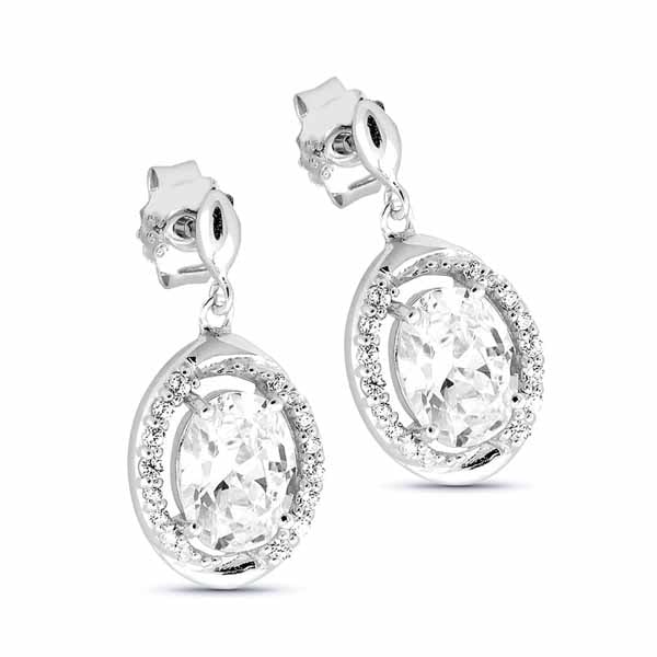 Hopeiset roikkuvat korvakorut zirkonia-korukivin koristeltuna. Suurempaa keskikiveä ympäröivät pienemmät zirkonia-korukivet. Korvakoruissa on tukeva tappikiinnitys.