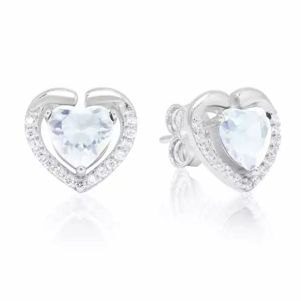 Hopeiset sydämen muotoiset korvakorut. Korvakoruja koristavat kirkkaat zirkonia-korukivet. Korvakorun koko on 10,5 x 10 mm. Korvakoruissa on tukeva tappikiinnitys.