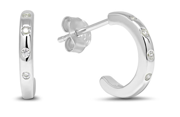 Naisten hopeiset korvarenkaat, joihin on istutettu kirkkaita zirkoneita. Hopeakorvakoruissa on luotettava tappikiinnitys ja niiden halkaisija on noin 8 mm ja leveys noin 2 mm.