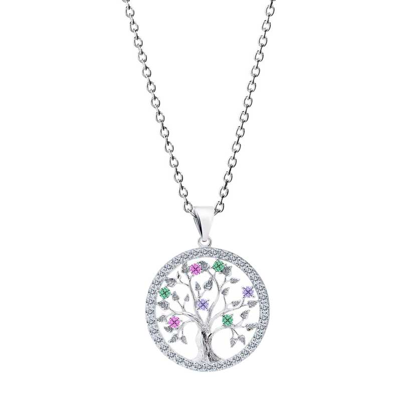 Hopeinen elämän puu riipus värikkäillä zirkoneilla Symbolinen elämän puu kaulakoru. Hopeakaulakorua koristavat säkenöivät vihreät, lilat ja pinkit zirkonia-korukivet. Hopeariipus on... Lue lisää