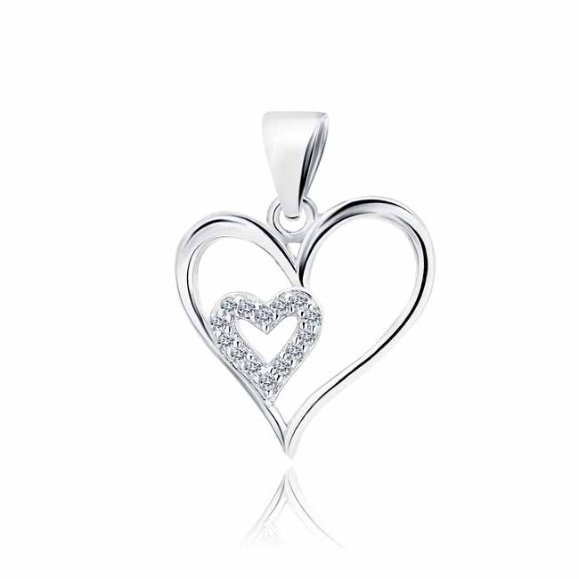 Hopeinen riipus kaksi sydäntä zirkoneilla Hopeinen sydänriipus kahdella sisäkkäin olevalla sydämellä. Sisempi sydän on koristeltu kirkkailla zirkonia-korukivillä. Riipuksen koko on 20 x 15... Lue lisää