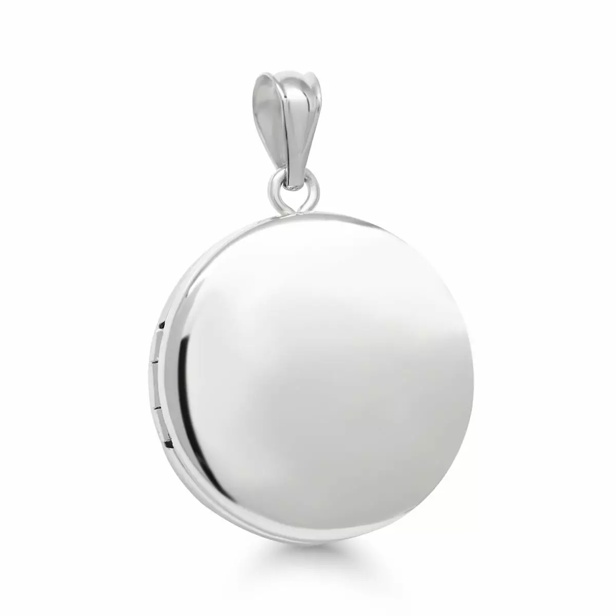 Pyöreä hopeamedaljonki, jonka sisällä on tilaa kahdelle kuvalle. Medaljongin etupuoli on kiiltävä ja takapuoli mattapintainen. Riipuksen koko on 20 x 20 mm. 925 hopeaa.