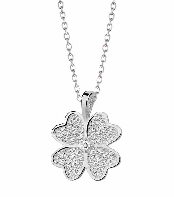 Hopeinen neliapila-kaulakoru, jonka terälehtiä koristavat kirkkaat zirkonia-korukivet. Hopeariipuksen koko on 15 x 12 mm ja ketjun pituus on 45 cm. Valmistusmateriaali on laadukas nikkelitön 925 sterling hopea. Siro hopeinen kaulakoru on täydellinen asuste jokapäiväiseen käyttöön!