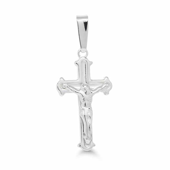 Hopeinen krusifiksi risti riipus, jossa sileät reunat keskellä krusifiksi. Sopii hyvin esim. rippiristiksi pojalle tai tytölle.