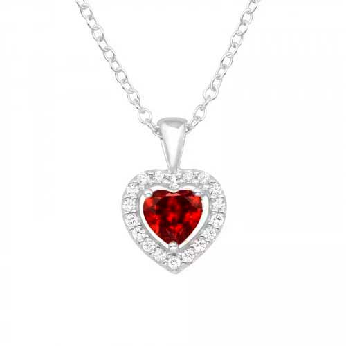 Naisten hopeinen sydänriipus. Sydämen muotoista hopeariipusta koristaa tummanpunainen zirkonia-korukivi, jota ympäröivät kirkkaat zirkonia-korukivet. Riipuksen koko on 9 mm.