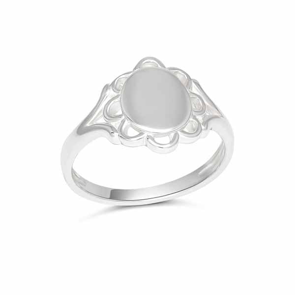 Hopeinen kastesormus koristeellisella ovaalilla koruosalla. Sirosta kastesormuksesta saa rakkaan muiston, joka kulkee mukana läpi elämän esimerkiksi hopeaketjuun pujotettuna.