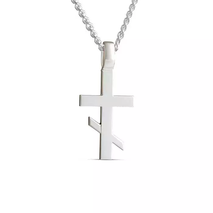 Pelkistetty ortodoksinen ristiriipus kahdella poikkipuulla. Hopearistin korkeus on 19 mm ja leveys on 9 mm. Hopearistin ketju on kätevästi säädettävissä pituuksiin 45 cm ja 50 cm.
