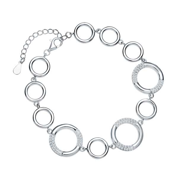 Naisten hopeinen rannekoru pyöreillä renkailla. Osaa renkaista koristavat kauniit kirkkaat zirkonia-korukivet. Ranneketjun pituus on kätevästi säädettävissä välillä 16-19 cm.