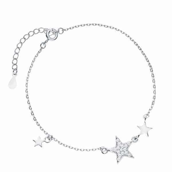 Naisten hopeinen rannekoru tähti-riipuksilla. Yhtä tähteä koristavat kauniit kirkkaat zirkonia-korukivet. Ranneketjun pituus on kätevästi säädettävissä välillä 16-19 cm.
