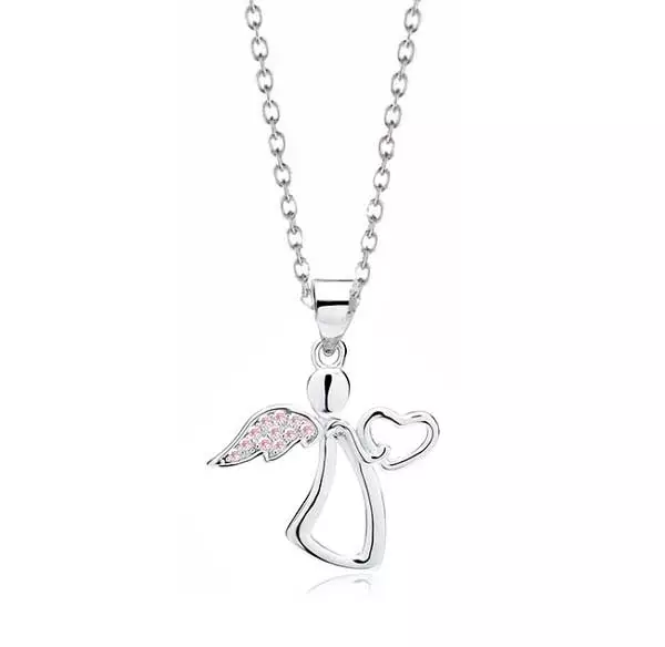 Hopeinen kaulakoru kauniilla symboliikalla. Hopeisessa riipuksessa esiintyy kaunis enkeli, joka kantaa sydäntä. Enkelin siivet on koristeltu pinkeillä zirkonia-korukivillä.
