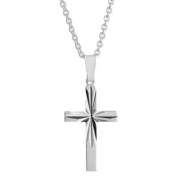 Timanttileikattu hopeinen ristiriipus. Hopearistin keskeltä löytyy valoa heijastava timanttileikkaus-kuviointi. Hopearistin korkeus on 18 mm ja leveys on 10 mm. Hopearistin ketju on kätevästi säädettävissä pituuksiin 45 cm ja 50 cm. Materiaali on laadukas 925 sterling-hopea, joka on platinoitu.
