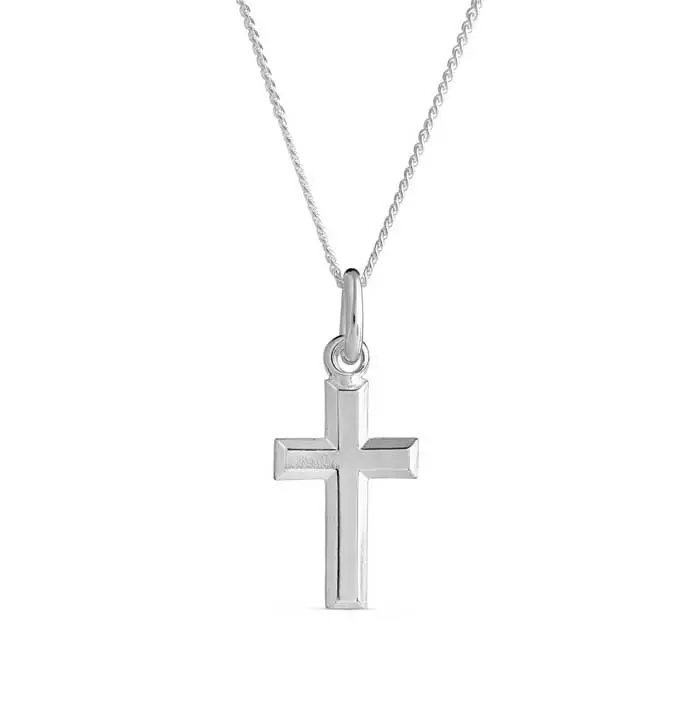 Pelkistetysti kuvioitu hopeinen ristiriipus. Kookkaan hopearistin korkeus on 23 mm ja leveys on 13 mm. Hopearistin ketju on kätevästi säädettävissä pituuksiin 45 cm ja 50 cm. Materiaali on laadukas 925 sterling-hopea, joka on platinoitu.