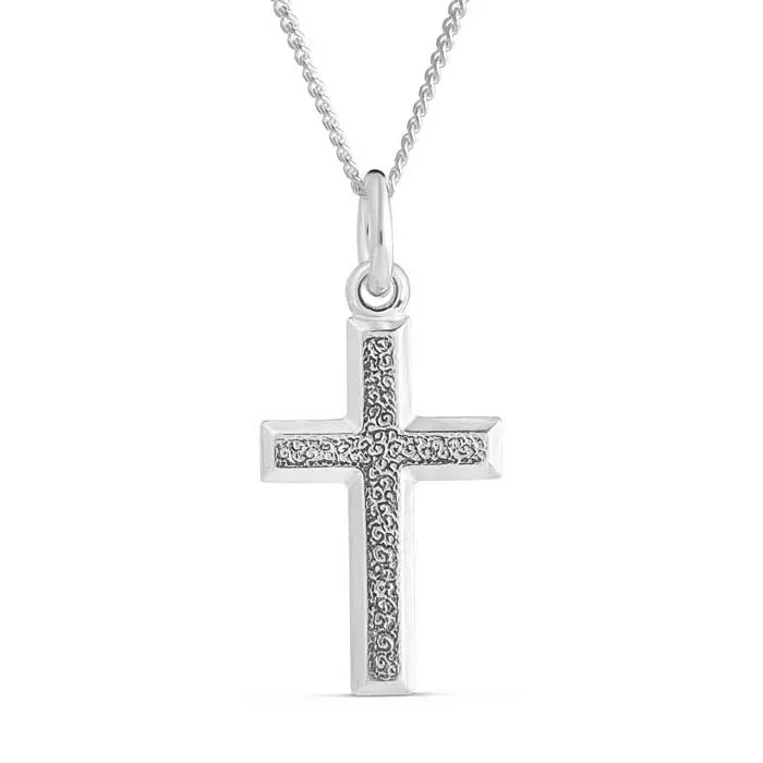 Hopeinen ristiriipus tyylikkään rosoisesti kuvioidulla keskustalla. Hopearistin korkeus on 23 mm ja leveys on 13 mm. Hopearistin ketju on kätevästi säädettävissä pituuksiin 45 cm ja 50 cm. Materiaali on laadukas 925 sterling-hopea, joka on platinoitu.