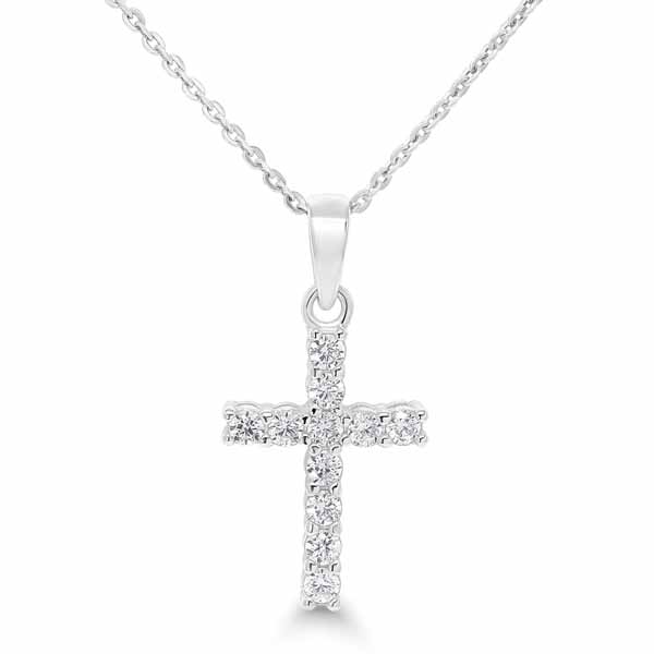 Klassinen hopeinen ristiriipus kirkkailla zirkonia-korukivillä. Ristin leveys on 11,5 mm ja korkeus ilman riipuslenkkiä 16 mm. Sopii erinomaisesti rippiristiksi!