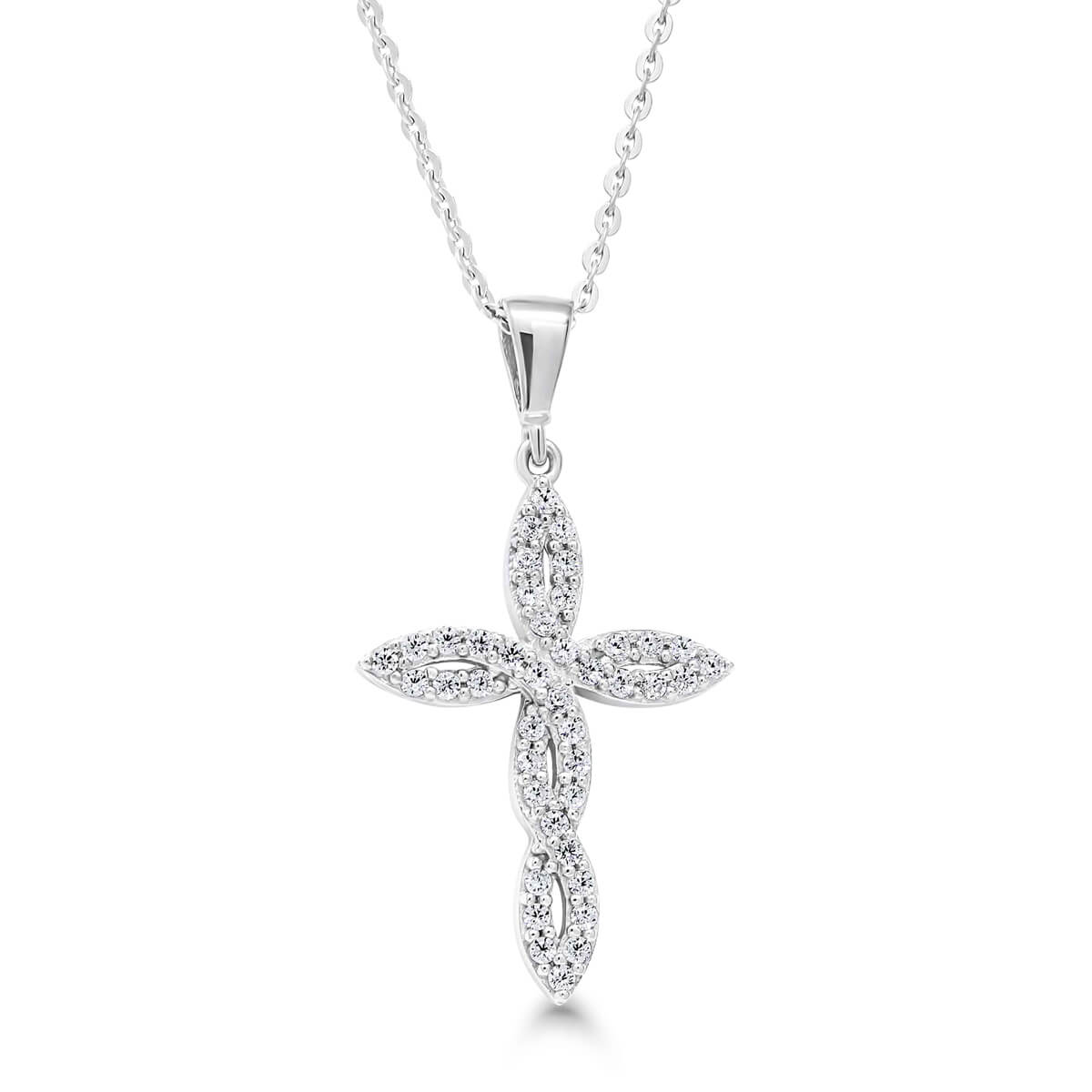 Hopeinen risti kauniilla muotokielellä ja kirkkailla zirkonia-korukivillä. Ristin leveys on 15,6 mm ja korkeus ilman riipuslenkkä 23 mm. Ketjun on säädettävissä välillä 40-45 cm.