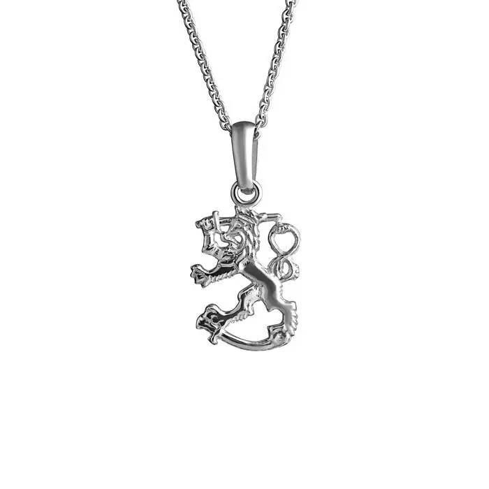 Hopeinen Suomi Leijona kaulakoru. Hopeariipuksen leveys on 10 mm ja korkeus on 12 mm. Hopeaketju on kätevästi säädettävissä pituuksiin 45 cm ja 50 cm. 925 sterling-hopeaa.