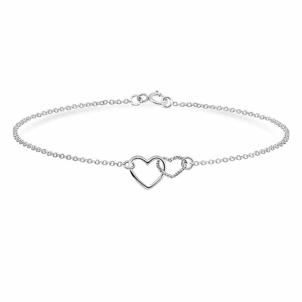 Naisten hopeinen rannekoru kahdella toisissaan lomittain kiinni olevalla sydämellä. Koruosan koko on 14,5 x 7,5 mm. Ranneketjun pituus on 18 cm. Nikkelitön 925 sterling hopea.