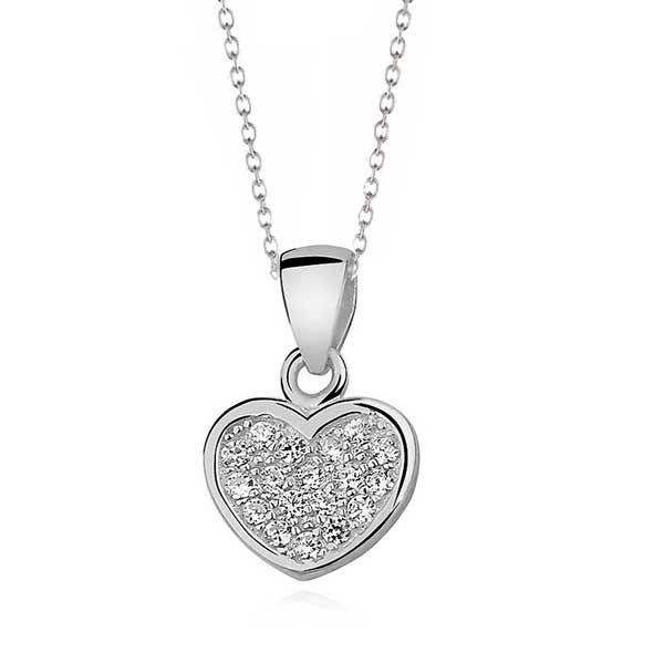 Hopeinen sydänriipus zirkoneilla Naisten pieni hopeinen riipus kirkkailla zirkonia-korukivillä. Sydämen muotoisen riipuksen leveys on 9 mm ja korkeus 14 mm. Hopeaketjun pituus on 42 cm.... Lue lisää