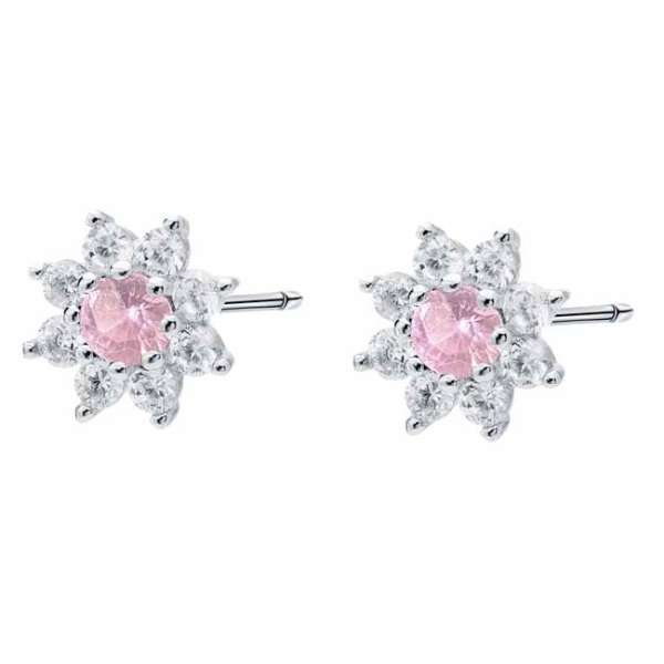 Hopeakorvakorut kukka vaaleanpunainen zirkonia Hopeiset kukkakorvakorut, joiden vaaleanpunaista keskikiveä kehystävät terälehtien kirkkaat korukivet. Nappikorvakorujen koko on 8 mm ja niissä on... Lue lisää