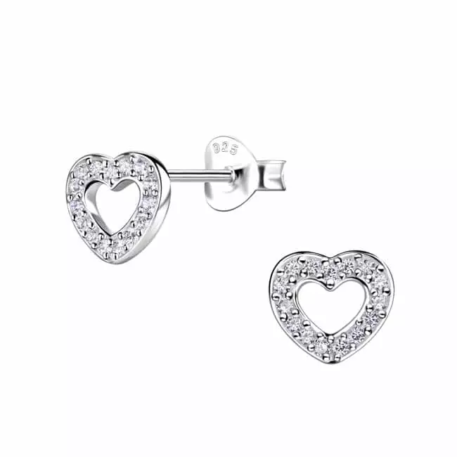 Sydämen muotoiset hopeiset korvakorut kirkkailla zirkonia-korukivillä. Korvakorun koko on 8 x 7 mm. Näissä siroissa korvakoruissa on luotettava tappikiinnitys. Korvakorujen valmistusmateriaali on laadukas nikkelitön 925 sterling hopea.