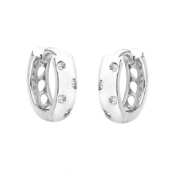 Hopeiset rengaskorvakorut, joiden kiiltävää hopeapintaa koristavat zirkoniat. Korvakoruissa on tappikiinnitys. Korvarenkaiden halkaisija on 13 mm ja leveys on 4 mm. Sirot ja kevyet rengaskorvakorut, joita voi käyttää arjessa! Korvakorujen valmistusmateriaali on laadukas nikkelitön 925 sterling hopea.