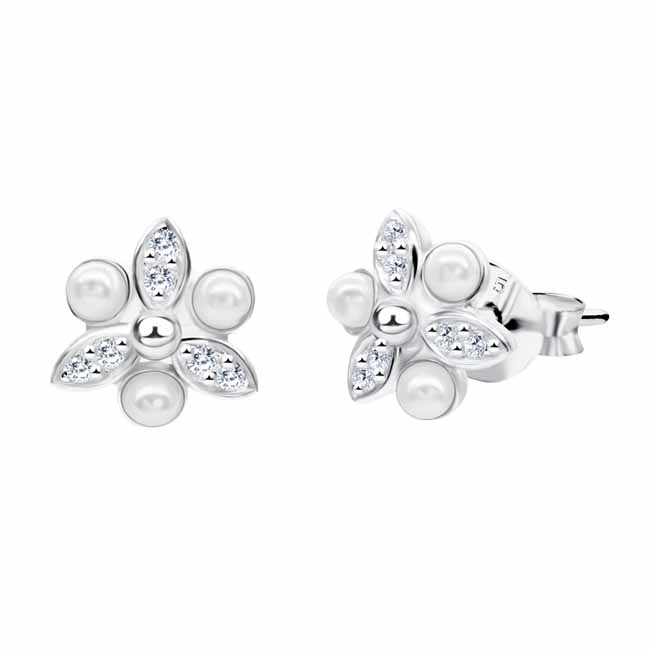 Hopeiset kukkakorvakorut helmillä Kukka hopeakorvakorut kirkkailla zirkoni-korukivillä ja synteettisillä helmillä. Nappikorvakorujen koko on 8,5 mm ja niissä on luotettava tappikiinnitys.... Lue lisää