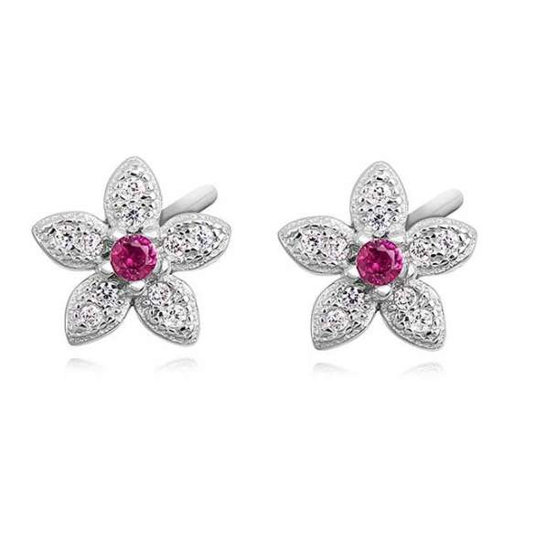 Hopeakorvakorut kukka punainen zirkonia Hopeiset kukkakorvakorut, joiden vaaleansinistä keskikiveä kehystävät terälehtien kirkkaat korukivet. Nappikorvakorujen koko on 6 mm ja niissä on... Lue lisää